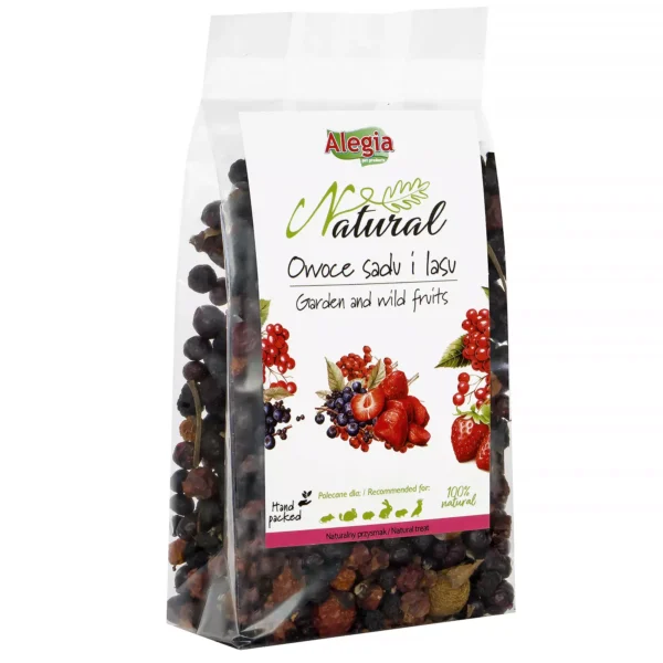 Naturalna mieszanka owoców sadu i lasu od firmy Alegia to wyjątkowa kompozycja starannie wyselekcjonowanych, suszonych owoców – dzikiej róży, jarzębiny, aronii, jagód oraz truskawek. To w 100% naturalna przekąska, stworzona z myślą o królikach, gryzoniach i ptakach, które uwielbiają smak owoców, a jednocześnie potrzebują urozmaicenia w codziennej diecie.
