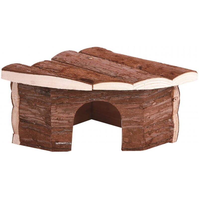 Narożny domek dla gryzoni wykonany z naturalnego drewna pokrytego korą. Bezpieczne miejsce do odpoczynku. Naturalny wygląd doskonale uzupełnia wystrój klatki.