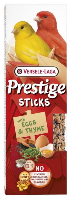 Prestige Sticks Canaries with Eggs & Thyme 60g to 2 opiekane kolby z jajkami i tymiankiem dla kanarków. Stanowią naturalną, pełnowartościową przekąskę i uzupełnienie codziennej diety.
