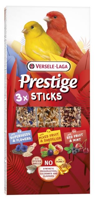 Prestige Sticks Canaries Triple Variety Pack 90g to 3 opiekane kolby (nasiona i kwiaty, mieszanka owoców i mniszek lekarski, czerwone owoce i mięta) dla kanarków. Stanowią naturalną, pełnowartościową przekąskę i uzupełnienie codziennej diety.