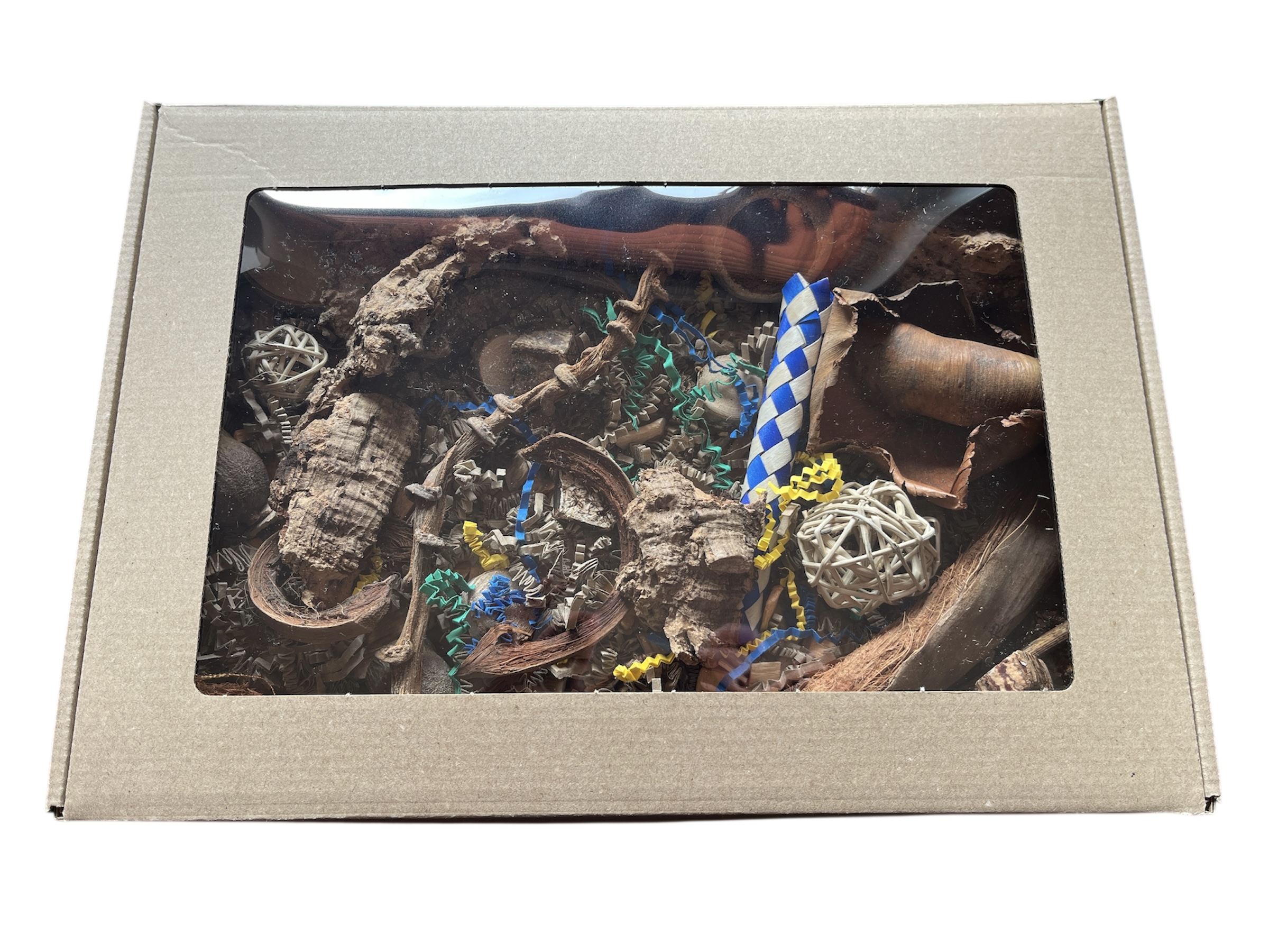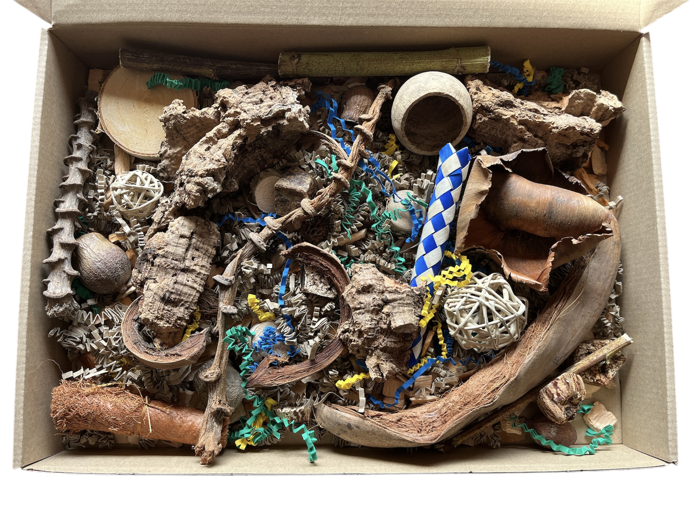 Kuweta zawiera starannie dobrane elementy, które zachęcają papugę do aktywności i samodzielnego zdobywania ukrytych przysmaków. W zależności od partii zestaw może zawierać różne naturalne komponenty i materiały do eksploracji.
